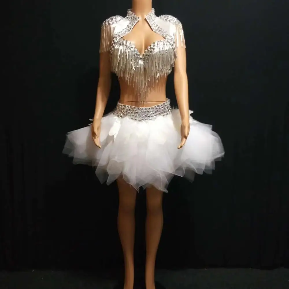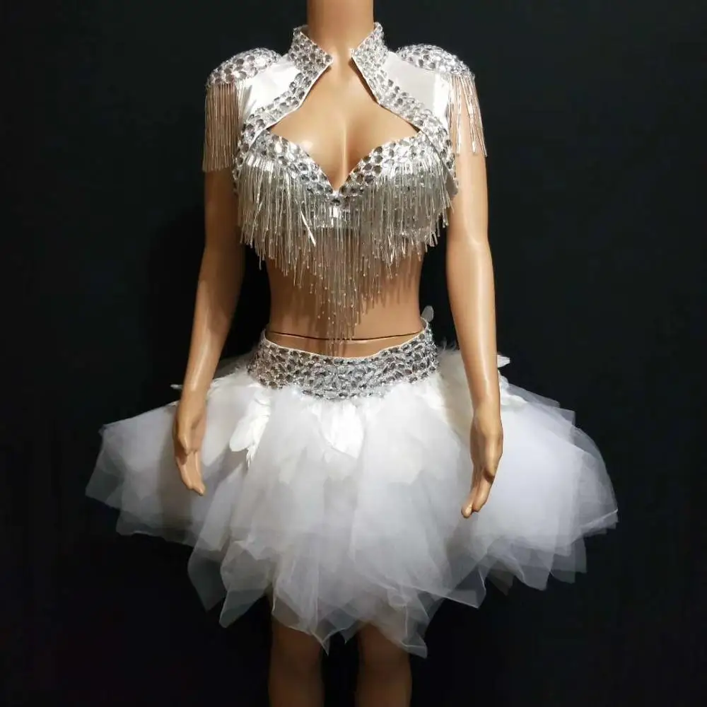Discount Sexy Silver Crystal Bikini Dancer Sets Tassel Bra Mesh Bubble Skirt Nightclub Party DJ DS Stage Out